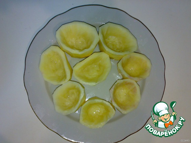 Картофель разрезаем пополам и вырезаем серединки. Вырезанную картошку оставляем на начинку.
