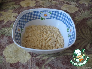 Теперь, когда готова начинка, займемся основой для ватрушки. Необходимо натереть на крупной терке пачку маргарина, добавить туда пол стакана сахара, два стаканы муки и пол чайной ложки соды. Все это перемешать руками. Должна получиться крошка.