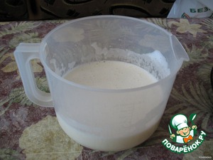 Для начала приготовим нашу начинку:хорошо взбить яйца 3 штуки, посте чего постепенно добавляя сахар 0,5 стакана, продолжаем взбивать. В эту массу добавим 250 грамм творога и хорошо перемешаем. Можно добавить и изюм, но это на любителя.