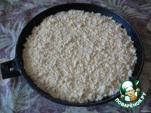 Чуть больше половины получившейся крошки мы укладываем на сковороду. Примерно таким образом...