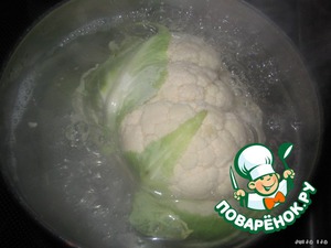 Цветную капусту разрезать пополам (у меня была небольшая, я использовала одну половинку. На две порции достаточно). Отварить в подсоленной воде до полуготовности (минуты 3-4).