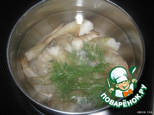 Креветки отварить в подсоленной воде, с добавлением веточки укропа. Если креветки варёно-мороженые, их нужно просто разморозить.