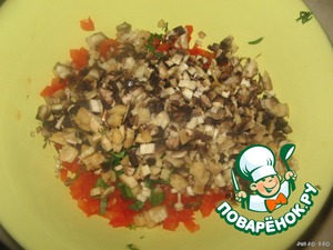Так же мелко нарезать зелень, и, хорошо вымытый и очищенный, шампиньон.