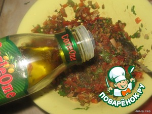 Посолить по вкусу, добавить сахар. Добавить 1 чайную ложку оливкового масла. Всё хорошо перемешать.
