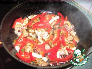 К морскому коктейлю добавить перчик, около минуты обжаривать.