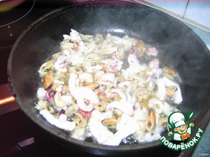 Морской коктейль обжарить в оливковом масле 2-3 минуты.