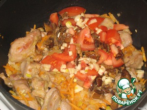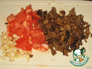 Пока мясо с овощами жарится, помидор, чеснок, отваренные грибы (бульон сохранить) нарезать и добавить в мясо.