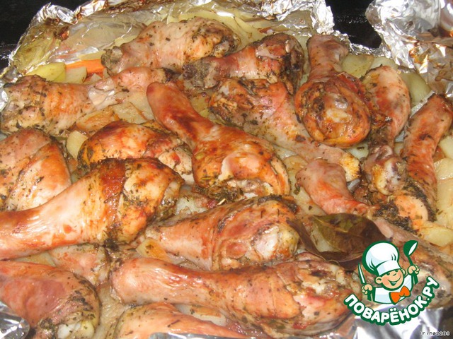 Куриную голень замариновать в специях, травах, уксусе с водой, посолить,поперчить. Вот чем мы мариновали сегодня (перечислять очень долго, поэтому наглядный пример лучше)