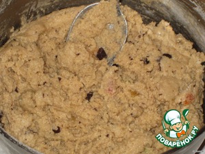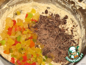 Все это добавить в тесто, перемешать, чтобы шоколад и цукаты равномерно распределились.