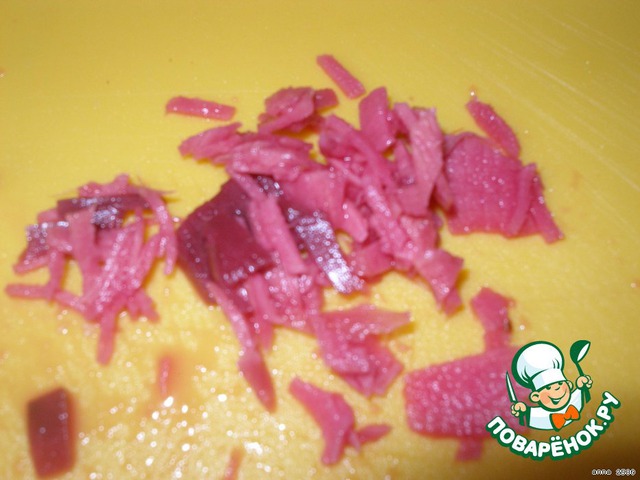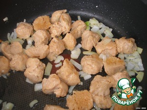 • По истечении этого времени мясо отжать и, если оно у Вас крупными кусками, нарезать на кусочки поменьше (примерно 1,5х1,5 см).