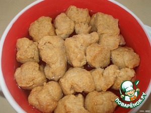 • Соевое мясо замочить в горячей воде на 20 минут.