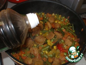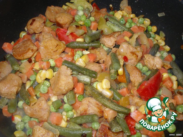 • Всыпать к мясу замороженные овощи и тушить под крышкой еще 5-7 минут.