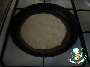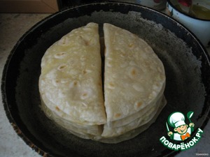 Взять уже готовое тесто,разрезать его на кусочки и скатать небольшие шарики.Каждый шарик раскатать на тонкую лепешку и выпекать,переворачивая,на раскаленной сухой сковороде до румяной корочки.
