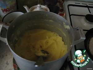 Теперь самое время заняться приготовлением начинки.Для этого нам необходимо приготовить картофельное пюре,добавить в него горячее молоко 40 грамм,растопленное масло 10 грамм,пассерованный репчатый лук 40 грамм и все перемешать.