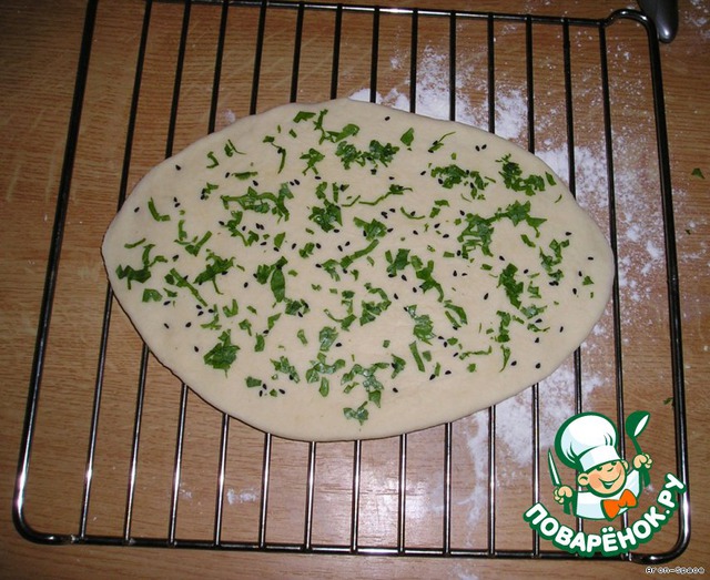 Разделите тесто на 6 равных кусков и раскатайте каждый кусок в овал, толщиной примерно в пол-сантиметра. При желании, каждую лепёшку можете посыпать зеленью и/или какими-нибудь зёрнышками. Я посыпал зеленью петрушки и чёрным кумином (зирой).