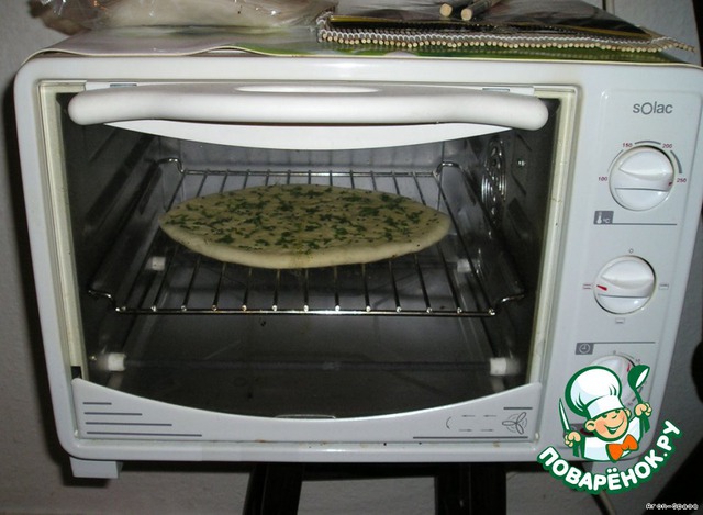 Поставьте это чудо в предварительно разогретую духовку на 5-10 минут. Лепёшка должна начать раздуваться и увеличиваться в объёме. Выпекать нужно при температуре 225 градусов до золотисто-коричневых пятнышек.