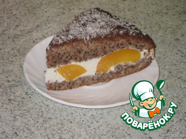 Захотелось сладенького приготовить, получилось вот такое "хорошее настроение": ореховый бисквит с творожным кремом и персиками в шоколадной глазури