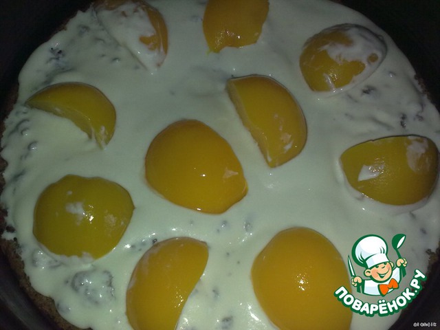 5 долек персиков (у меня просто большая банка персиков в сиропе оказалась) делим пополам каждую и укладываем, немного утапливая в крем, сверху выкладываем оставшийся творожный крем.