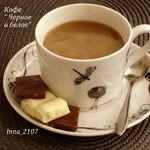 Рецепт навеян запахом свежемолотого кофе. Множество рецептов приготовления кофе, а этот - мягкий, ароматный - полюбят все, кто любит кофе, шокoлад - и не может без них жить, одним словом: 2 в 1! Зeрна хорошего сорта кофе - лучше арабика, свежемолотые. Мерная ложка кофе на 1 порцию и 200 мл кипятка... Шоколад - самый чeрный - желательно без добавок. У меня был чернее-чeрного: 81 %, но есть ещe чернее!!! Белый шоколад - без добавок, я взяла просто couverture. Количество школада на порцию - чтоб в измельчeнном виде помещалось в чайной ложке (но измельчать не обязательно... ) По желанию вы можете добавить молоко/сливки, сахар, ваниль, ликeр, коньяк... Но я ничего не добавляла... Сначала попробуйте кофе, а потом решайте, что к нему добавить - и вообще, добавлять ли?
