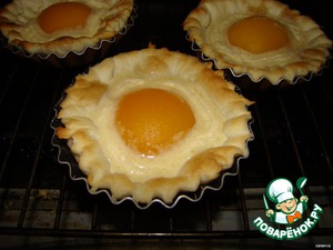 Достали наши корзиночки и вокруг персика наполнили заливкой и еще раз в духовку на 10 минут(Смотрите .как подруманились готовы)