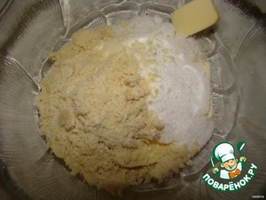 Тем временем готовим заливку Разотрите масло с сахаром .Добавьте измельченный миндальный орех (У меня был резанный я его измельчила в кофемолке)Хорошенько все перемешайте