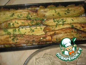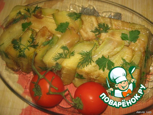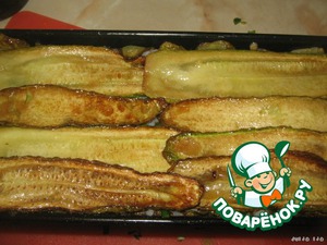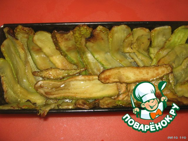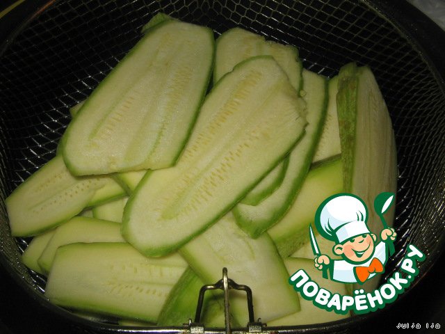 Кабачки нарезать вдоль, тонкими пластинами (не прозрачными, миллиметра 3 толщиной). Обжарить на растительном масле. Я - во фритюрнице.