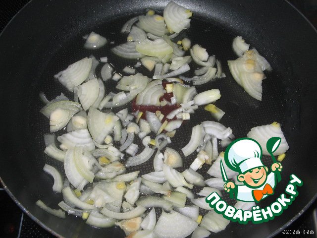 Лук, нарезать соломкой, обжарить на растительном масле.