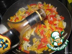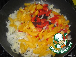 Добавить перец, нарезанный соломкой. У меня разного цвета просто для красоты. Немного обжарить.