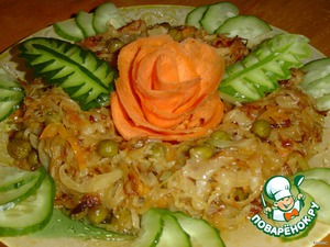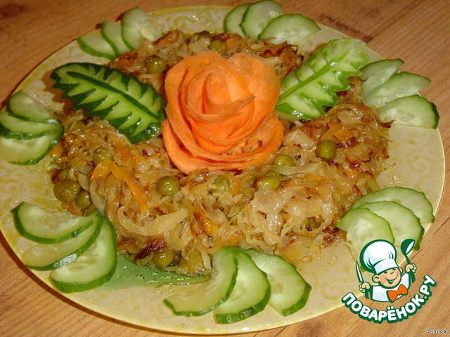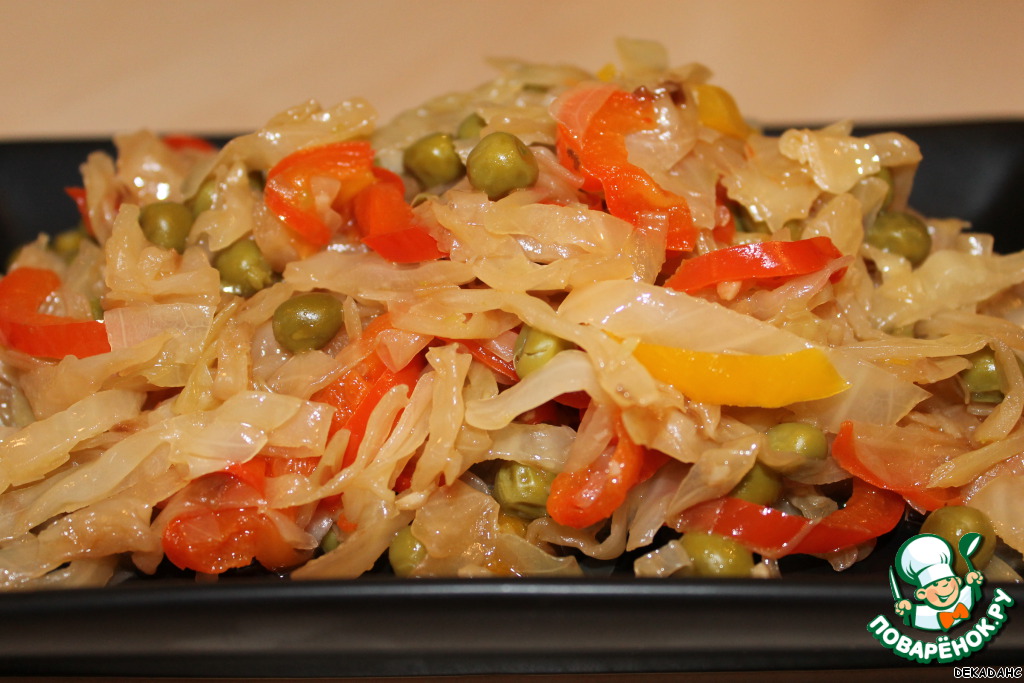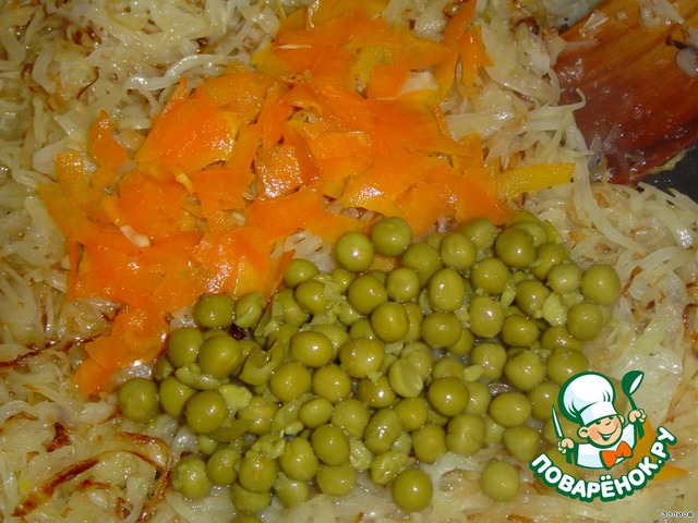 В конце приготовления добавить зеленый горошек и мелко нарезанный перец. Посолите по вкусу. Вот капуста и готова!