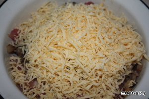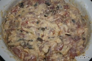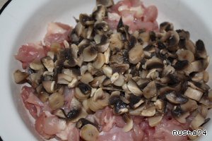 • Грибы мелко нарезать и отварить, добавить к мясу