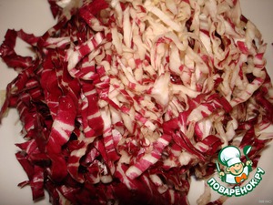 К шампиньонам добавить нарезанный полукольцами лук, жарить до прозрачности лука. Затем добавить радиччио и слегка обжарить.