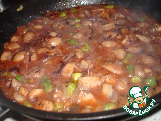 Залить всё небольшим количеством грибного бульона, добавить нарезанную спаржу, кетчуп, соль по вкусу и ещё немного потушить.