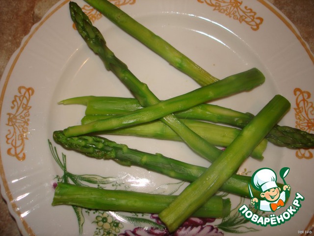 Спаржу помыть, слегка почистить, отварить пару минут в кипящей подсоленной воде.
