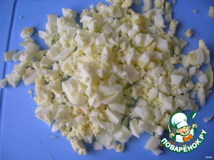 В идеале для салата подходят перепелиные яйца, но за неимением таковых, используем куриные. Также мелко нарезаем.