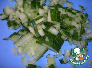 Очень мелко нарезаем свежий огурец.