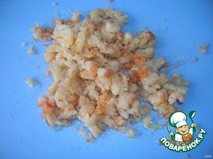 Мелко режем креветки.