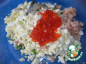 Добавляем красную икру, майонез, всё перемешиваем.