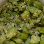 Нагрейте сковороду с растительным маслом, обжарьте кабачки, после чего залейте их приготовленной заправкой и тщательно перемешайте. Тушите еще 2 -3 минуты. В конце добавьте измельченный чеснок.