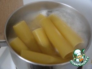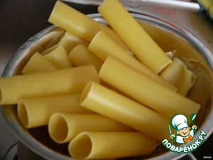 Отварить каннеллони.Для этого закинуть их в кипящую подсоленную воду. И оставить на две минуты.