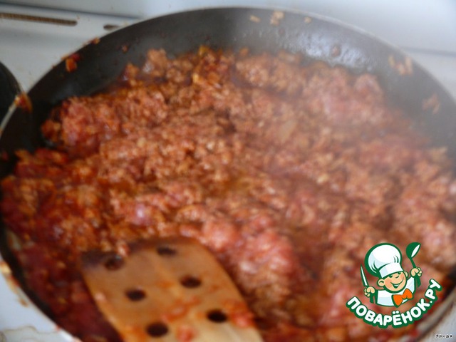 В зажарку добавить две ст.л. томат пасты и фарш. Жарить до готовности,затем посолить и добавить приправу. Остудить.