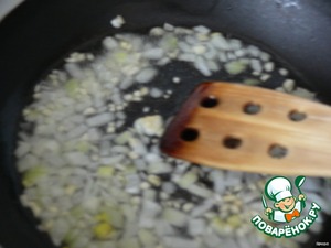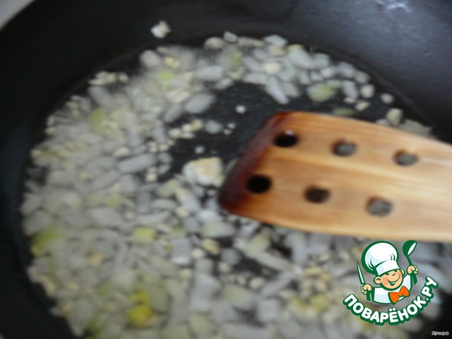 Лук и чеснок порубить кубиками и обжарить на растительном масле.