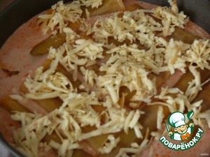 Посыпать колбасным сыром,потертым на крупной терке.Выпекать 20минут при 180С.