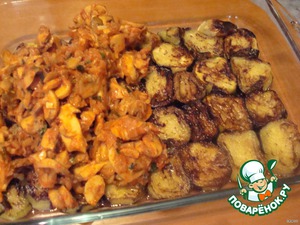 в глубокую форму размером 20 на 30 см. выкладываем очень плотно баклажаны сверху соус с грибами и разравниваем.