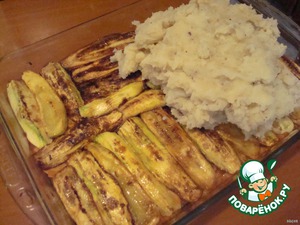 затем кладем кабачки и сверху пюре.