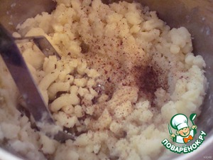 очищаем картофель и отвариваем в подсоленной воде. Делаем пюре: давим картофель, добавляем немого воды в котором варился картофель, перец, соль, мускатный орех, оливковое масло. все хорошо перемешиваем.