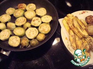 моем и очищаем баклажаны и кабачки, режем кружочками 1,5 см. в глубокую чашку кладем овощи солим, заливаем холодной водой. оставляем на 30 мин. далее обжариваем в небольшом количестве масла.