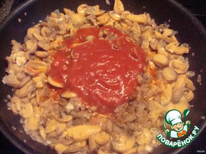 Обжариваем в небольшом количестве масла мелко резаный лук и чеснок, добавляем нарезанные грибы и жарим 5 мин. далее добавляем томат. пасту разведенную в воде, соль, перец, петрушку и тушим пока не загустеет соус.