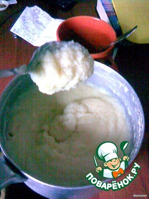 Смешать молоко с сахаром и закипятить.Постепенно всыпаем манку и варим кашу без комков.Когда крупа разварится,снимаем кашу с огня и даем ей остыть -