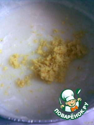 добавляем яйца к каше и продолжаем взбивать еще минуты 3.Добавляем цедру,натертую на мелкой терке и ставим опять на огонь.Варим пока смесь не будет кремообразной.