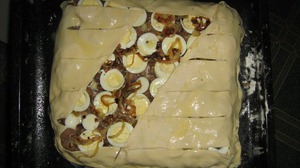 Накрываем последним слоем тонко раскатанного теста, сверху старалась сделать что-то оригинальное...вышло вот так. Смазываем яичком, чтобы наш пирог красиво блестел и в духовку.